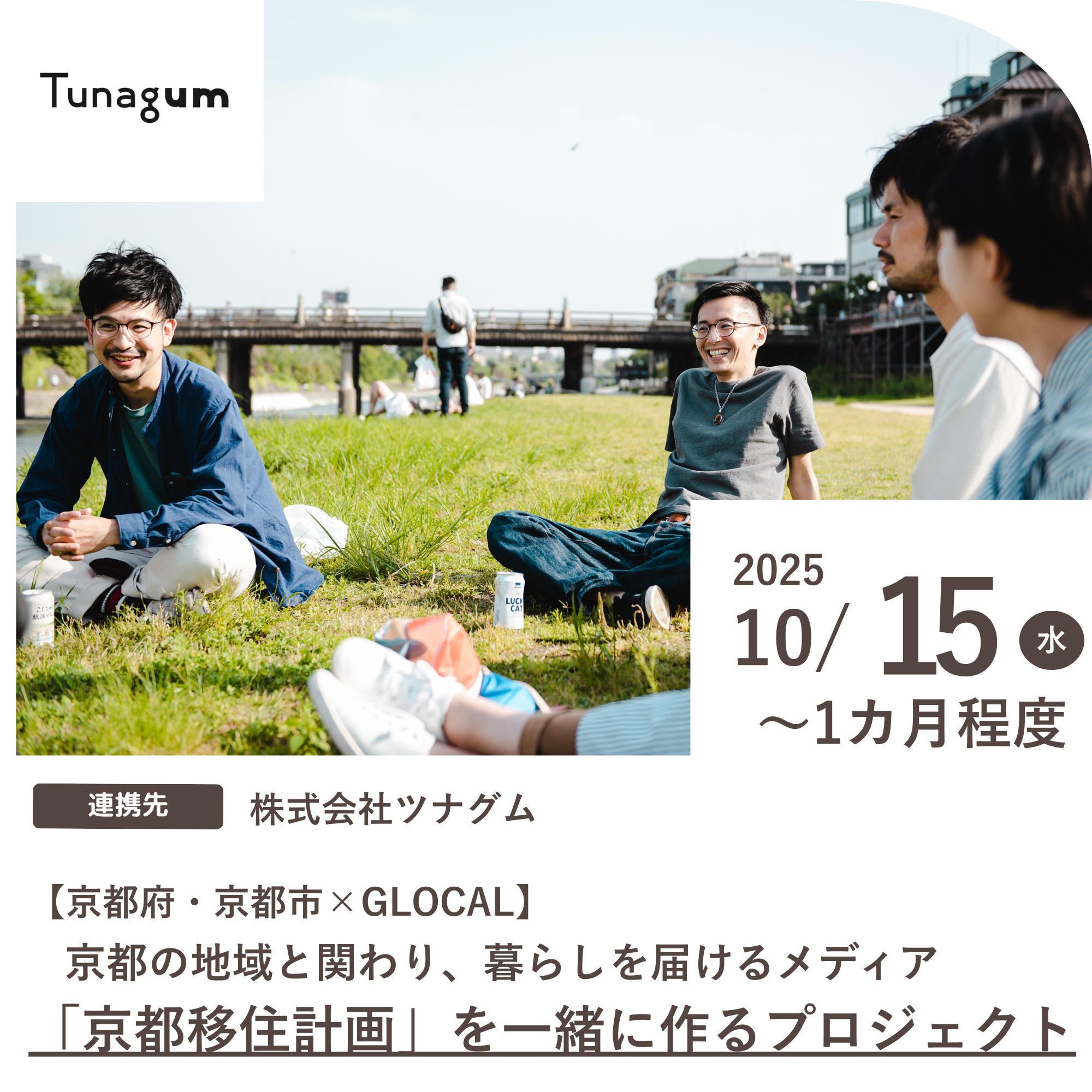 【プログラム概要】 〇日時:2025年 10月 15日(水曜)~1カ月 ※1週間に1回程度の活動を予定 〇連携先企業:株式会社ツナグム(〒602-8233 京都市上京区福大明神町128) 〇実施場所:QUESTION S … 続きを読む 🌟募集中【京都府・京都市×GLOCAL】京都の地域と関わり、暮らしを届けるメディア「京都移住計画」を一緒に作るプロジェクト